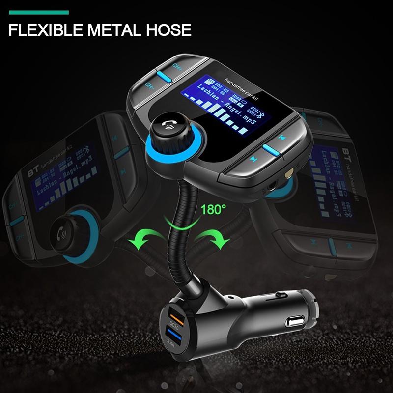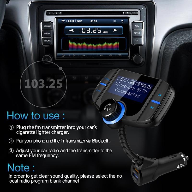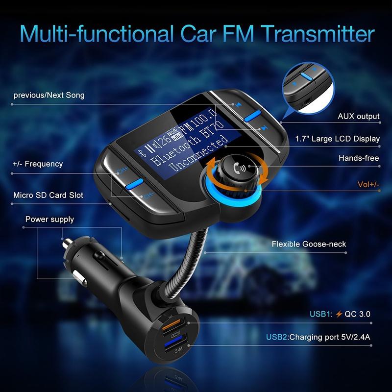 Special design: large key for easy operation; 1.7 Inch large LCD backlight display song name/ incoming phone number and shows your cars battery level when car start; Can rotate the LCD display screen in 270-degree gooseneck for optimal viewing comfort; Turn off the FM transmitter: long pressing the next song key for 5 seconds, it will turn off the FM and Bluetooth functions keep charging function