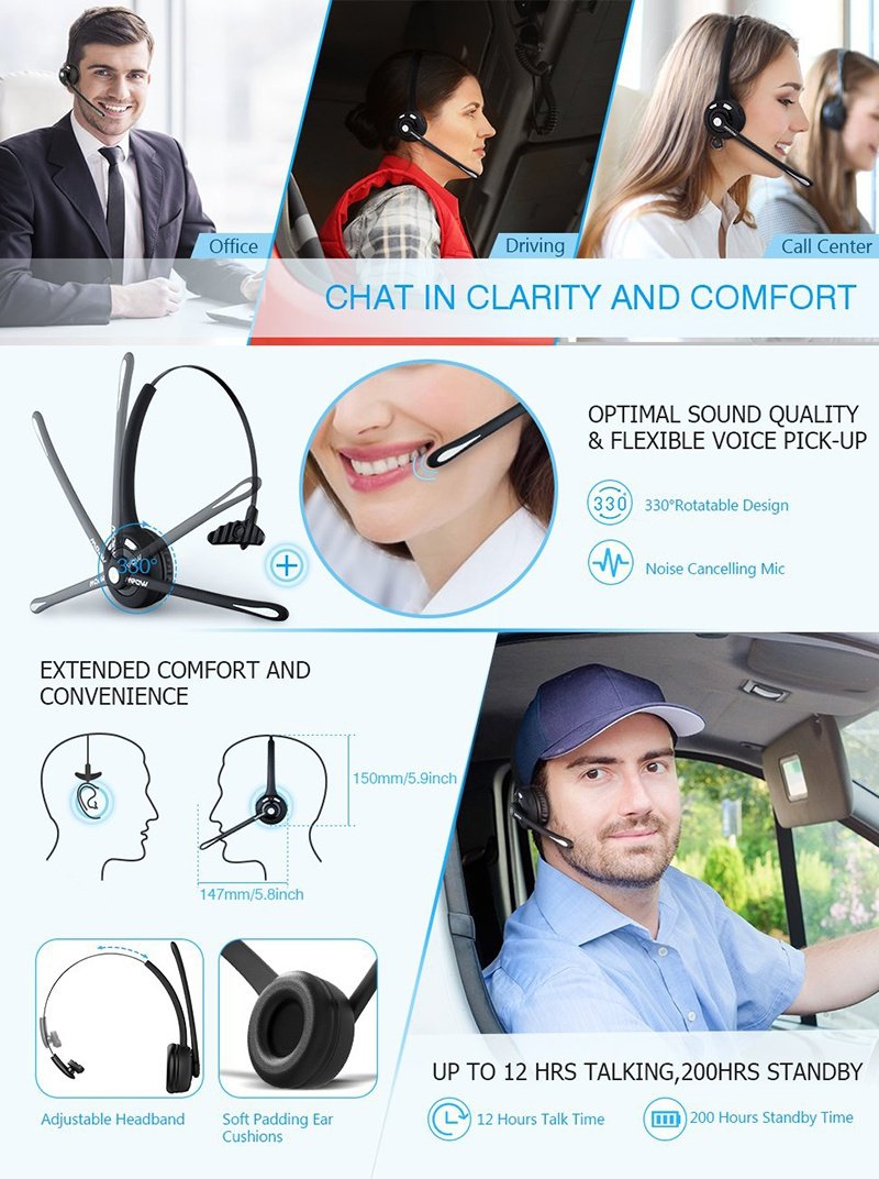 Professional Over-the-Head Rechargeable Wireless Bluetooth Headset is featured with Microphone Noise Cancelling and provides 12 Hours Talking Time.