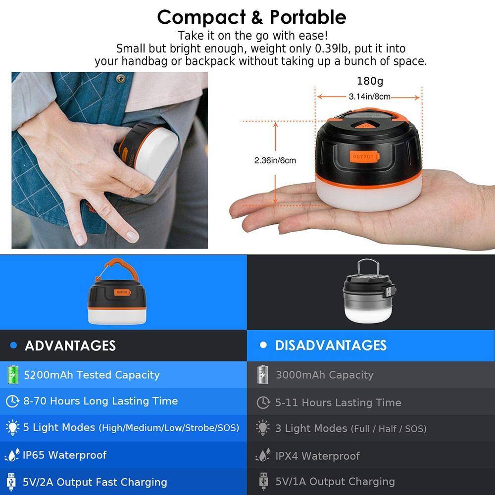 Camping Lights, LED Tent Light with Power Bank 5200mAh, USB Camping Lantern Rechargeable Ultra Bright LED Emergency Camping Light for Tents