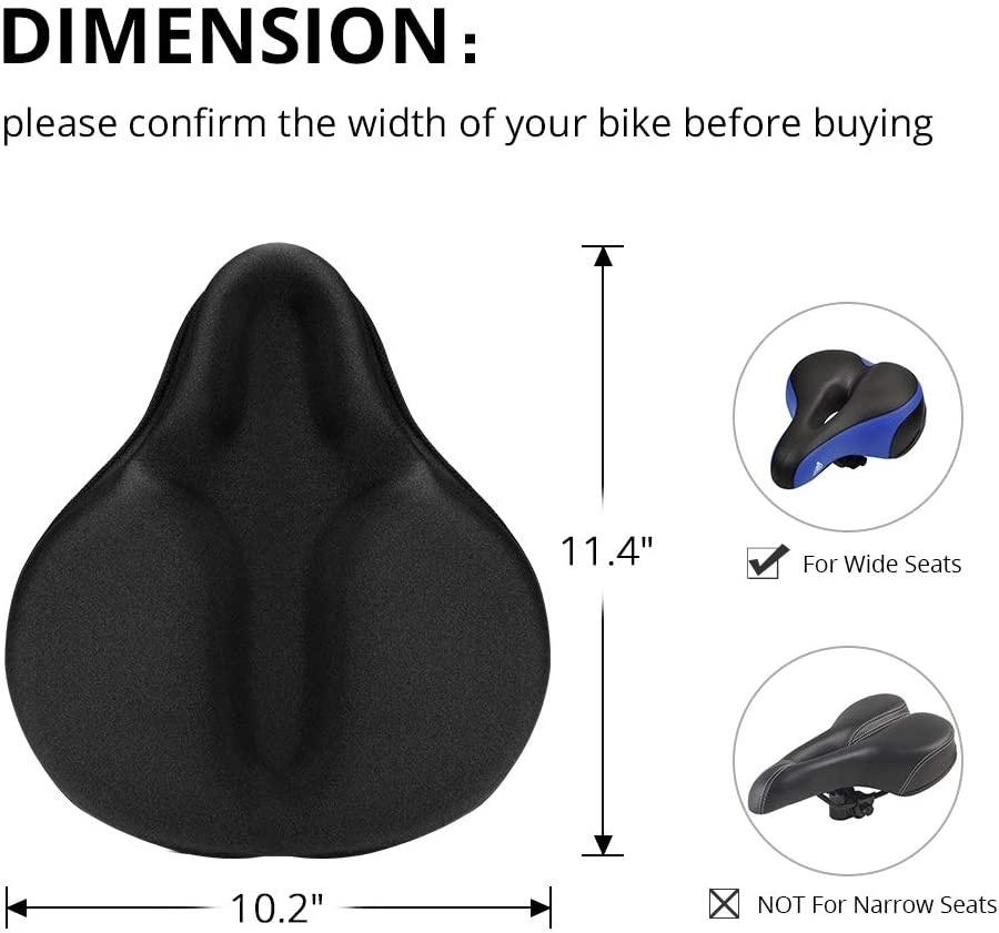 Wide Bicycle Seat for Wide Bike - bicycle seat cushion size in 11.81 x 10.63 x 2 inches (L*W*H). Weight 17oz. Fits for the width of bicycle seat in the range of 8.5-10 inches. Fits perfect with mountain bike, spinning bike, exercise bike, road bike, cruiser bike, electric bike.Please measure your bike seat size before purchasing and confirm if our bicycle seat cover meets your requirements