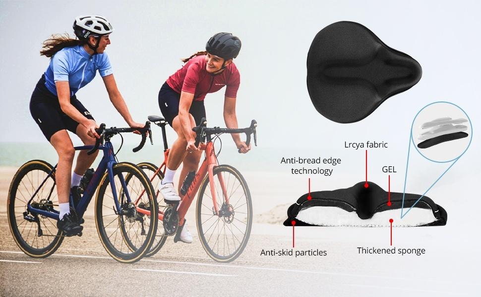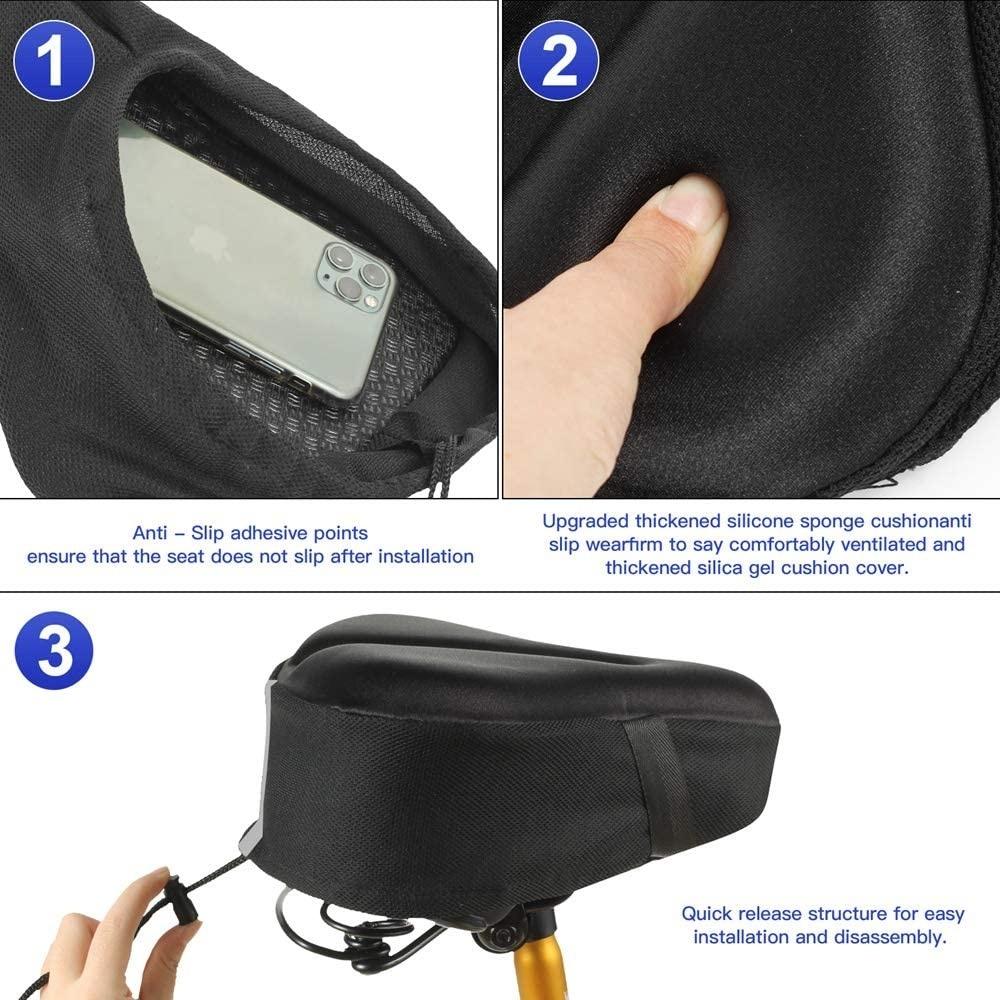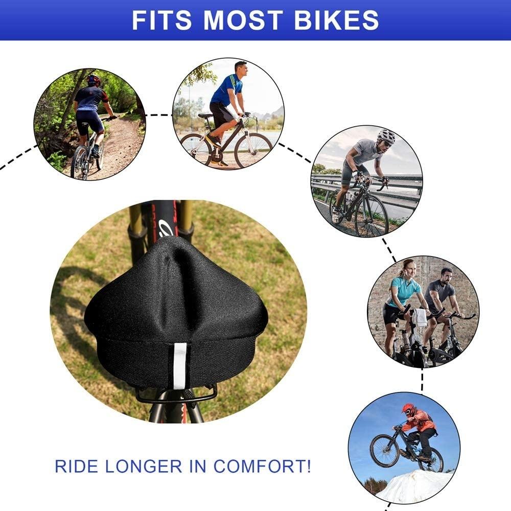 Extra Wide Bike Seat Covert: Oversized bike seat cover with extra padded gel makes it great for your prostate and tailbone relief.The surface of this padded bike seat cushion is Lycra fabric, moisture absorption, fast dry, comfortable, breathable. Plus air diversion slot design in the middle of exercise bike seat cover, speed up air circulation, keep buttock cool dry. Ultra soft bike seat cushion helps you say goodbye to the pain and enjoy the fun of riding a bike now