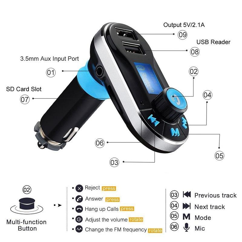 his is a new Bluetooth MP3 Player FM Transmitter Hands-free Car Kit Charger, which support USB driver and Micro SD card and can automatically play and transmit the MP3 files of USB driver and Micro SD card after matched with your radio by the frequency. Simply paired your phone with the Bluetooth FM Transmitter and its hands-free system can set free your hands during answer the calls and let you safely drive. Moreover, this item has high-performance built-in microphone which can offer your clear talking and wonderful music, and it has two USB charging port to charge your portable devices. With this product, you can greatly enjoy the music and picking the call up, and have no need to worry about your mobile devices is lack of electric energy. It is perfectly suitable for the car owners. You will love it! Buy it today! You cannot miss it!