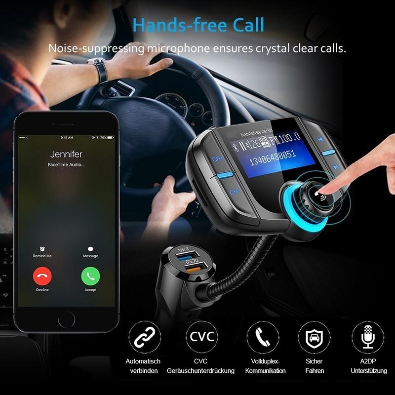 It will automatically enter into hands-free mode from music playing mode when receiving a call. The Bluetooth FM transmitter adopts advanced interference and CVC noise cancellation technology to provide you high clear sound and call quality.