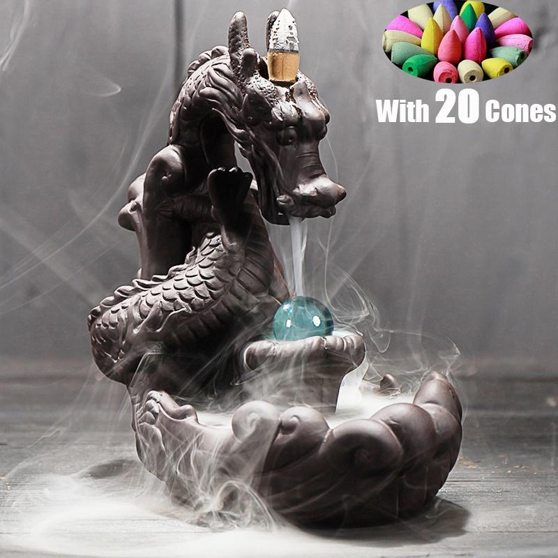 Incense Holder Dragon Backflow Incense , Chinese traditional Handmade Ceramic Home Decor handmade gifts Can help sleep + 20 Backflow incense cones [<lun>]