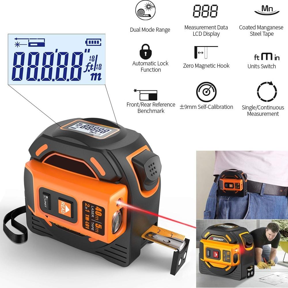 2. Dual Mode Ranging: laser meter 40m/ and tape measure 5m