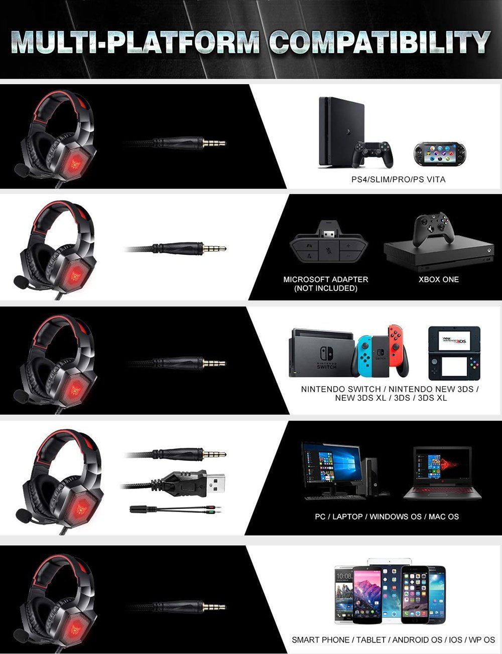 MULTI-PLATFORM COMPATIBILITY FOR PLUG AND PLAY. Gaming headset works on PS4, PS3 (Adapter needed), PS vita, PSP, Xbox One, Nintendo Switch (audio), Nintendo New 3DS LL/3DS (audio), Nintendo 3DS LL/3DS (audio), Windows PC, Mac OS PC, iOS device and Android device. Xbox One headset adapter might be needed. With Gaming headset, gamer can always enjoy a immersive gaming experience no matter in which platform. Plug and play.